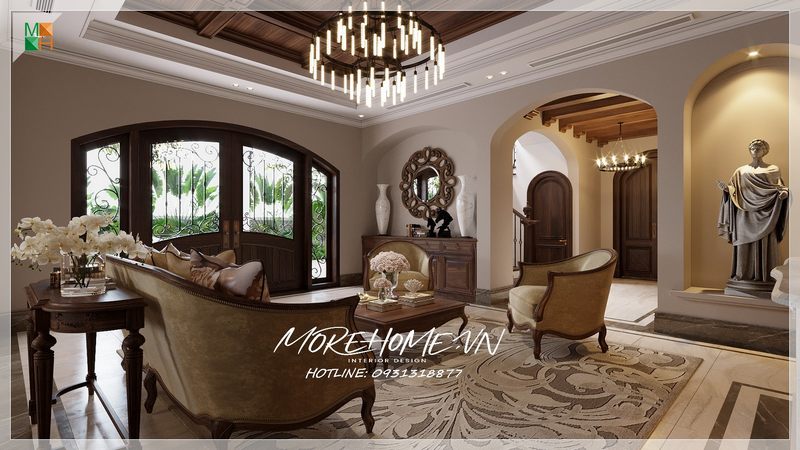Để tạo nên phong cách tân cổ điển cho căn hộ, nhà phố, biệt thự, gợi ý thiết kế phòng khách với nội thất gỗ óc chó tông màu nâu sang trọng.