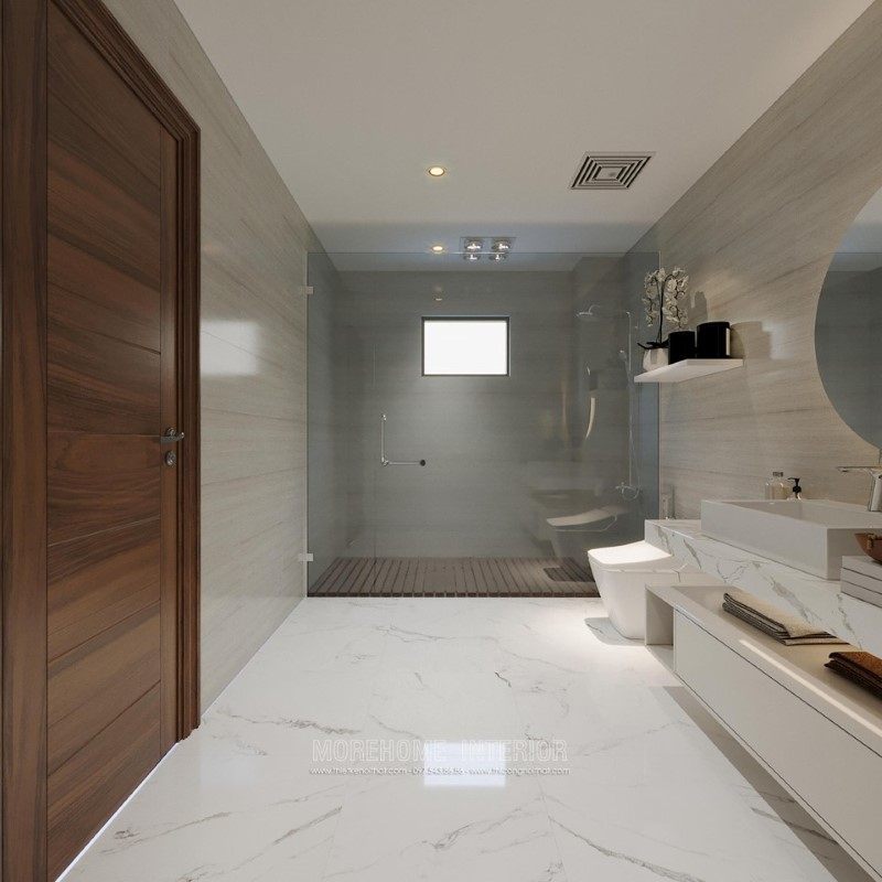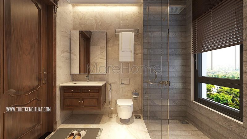 Cửa 1 cánh gỗ óc chó cổ điển mang lại vẻ đẹp sang trọng và tính thẩm mỹ cao cho phòng tắm.